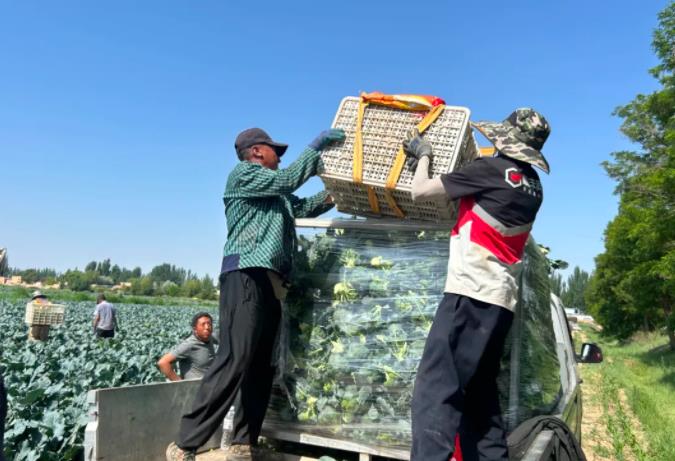 在宁夏盛世丰现代农业开发有限公司生产线上,工作人员把刚从田地里采摘下来的西兰花进行整理、冰存、打包、装箱,一株株绿油油的西兰花从这里装箱走出冷库,运往上海、武汉等外地市场。