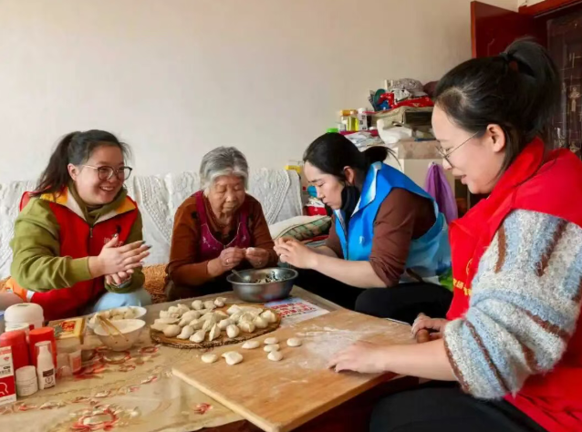 “宋奶奶,您看这饺子馅儿咋样?要是觉得淡,我再加点盐。”在农场社区独居老人宋学霞家中,党员志愿者吕丹和刘纯丽正手把手跟着老人学调馅儿,擀面杖滚动的声响与欢声笑语交织在一起。宋奶奶一边捏着饺子边儿,一边拉着志愿者的手念叨:“孩子们工作忙,平时我一个人吃饭总对付,今天你们来,家里热闹得像过年!”不一会儿,热腾腾的饺子出锅,志愿者们端着碗送到老人面前,看着老人吃得香,大家的脸上也露出了笑容。