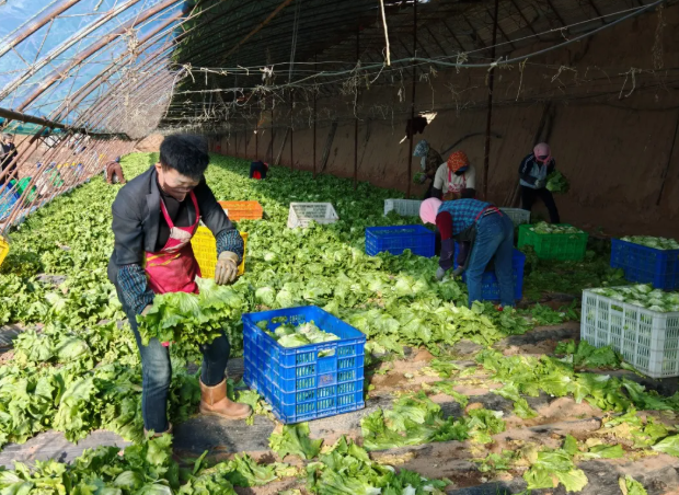 春回大地,万物勃发。在崇兴镇龙徐滩村的圆生菜种植基地里,一排排标准化温室大棚整齐排列,棚内鲜嫩翠绿的圆生菜长势喜人,种植户张贤正带着农户们忙着采收、打包、装车,一派热火朝天的丰收景象。