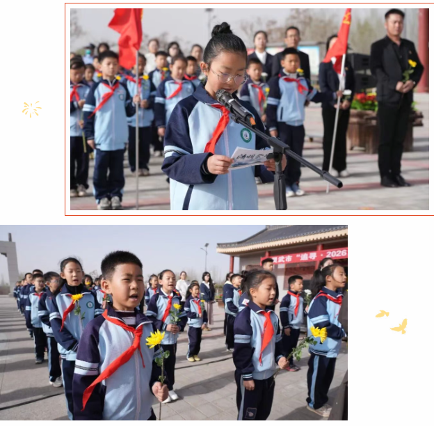 少先队员代表朗诵致烈士的一封信,字字饱含深情,句句诉说敬仰,向革命先烈许下传承遗志、奋勇前行的少年誓言。随后,少先队员们献唱《我们是共产主义接班人》,用嘹亮的歌声表达新时代少年沿着先烈足迹勇敢前进的远大志向。