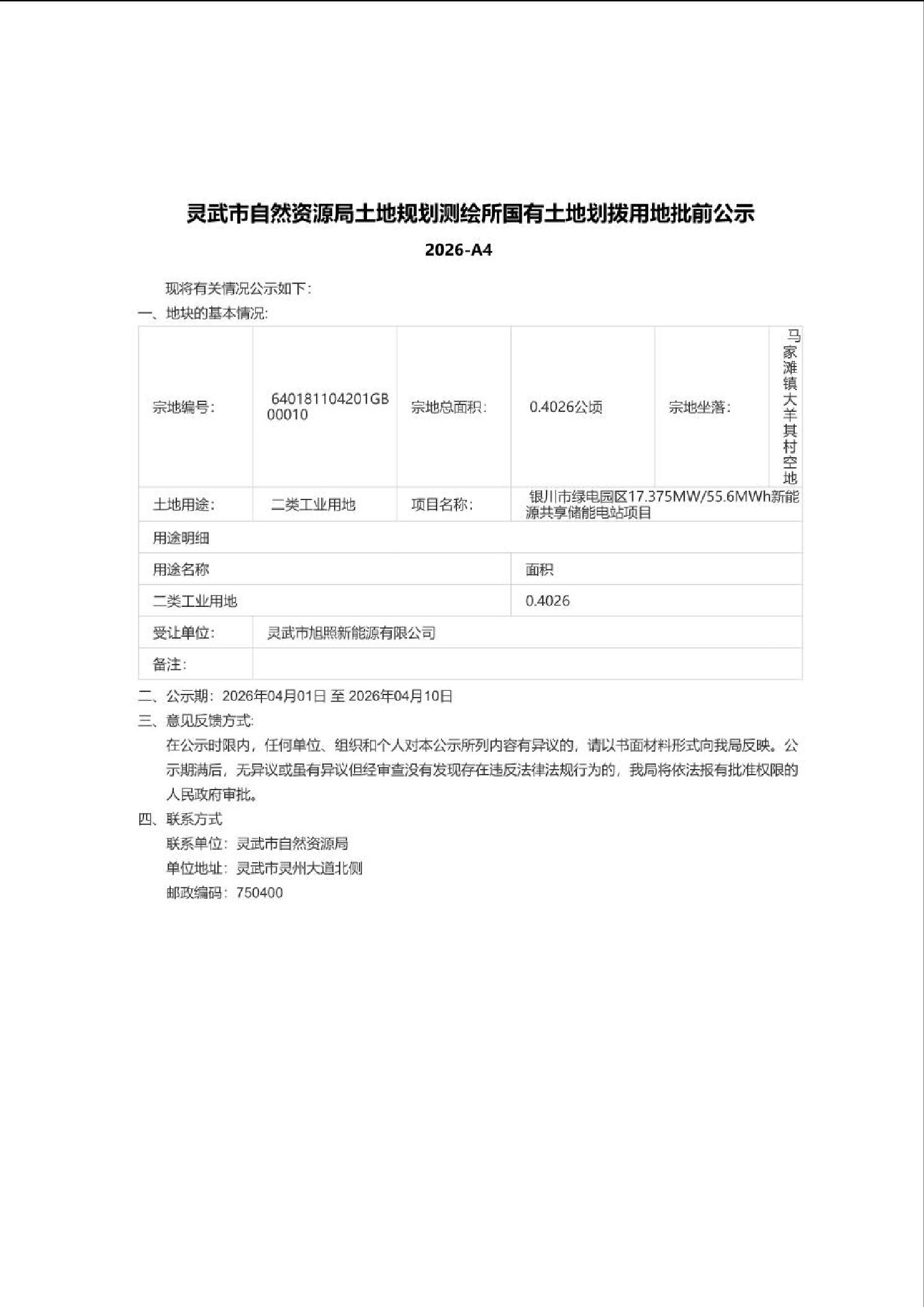 灵武市自然资源局土地规划测绘所国有土地划拨用地批前公示2026-A4