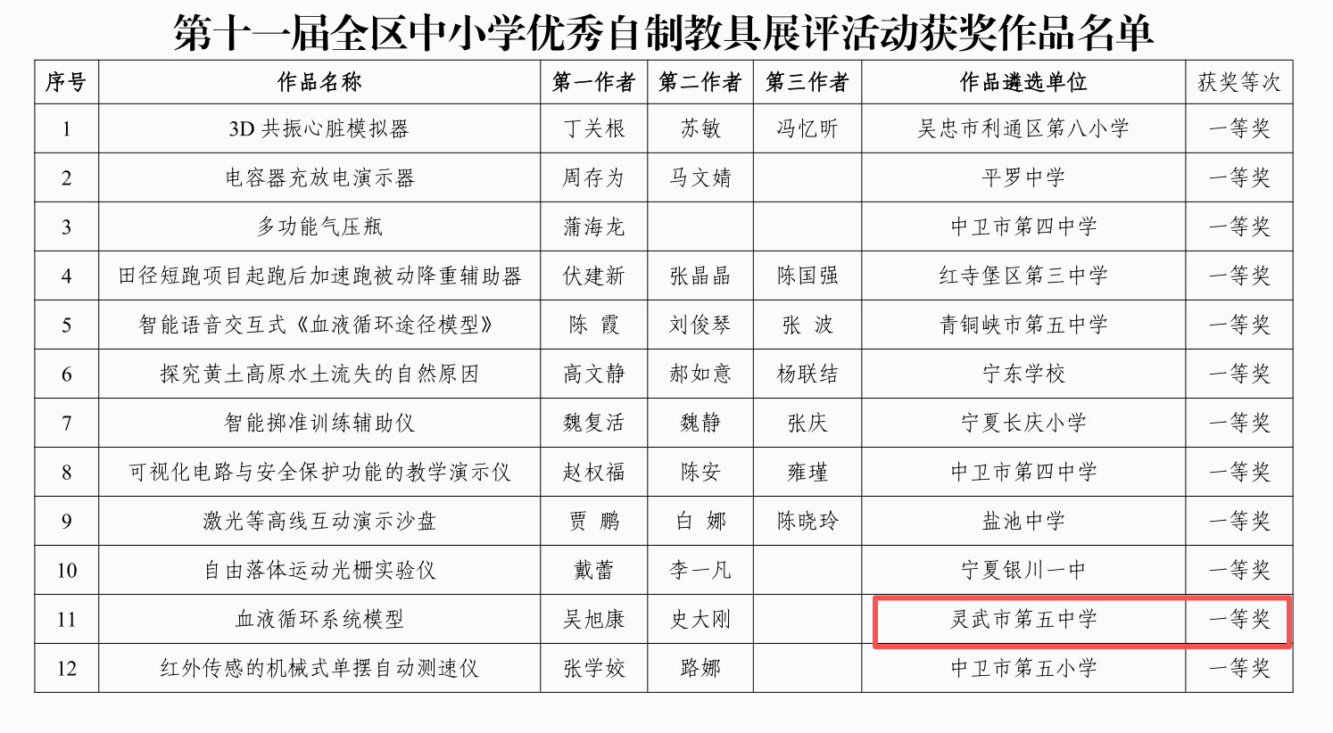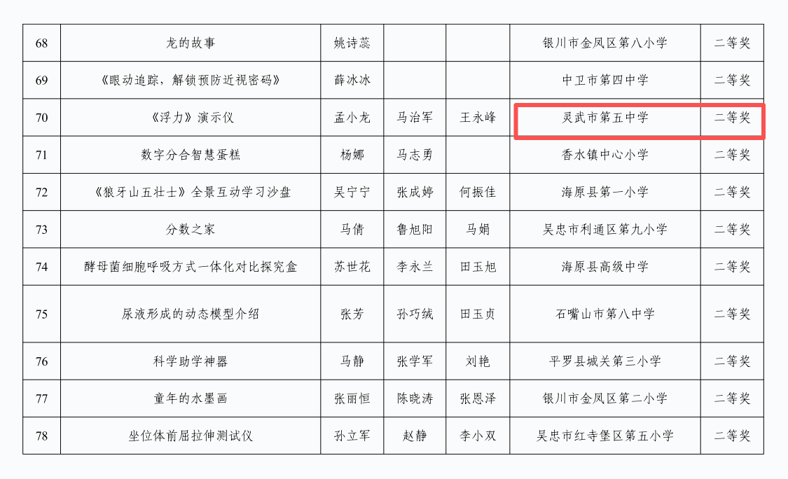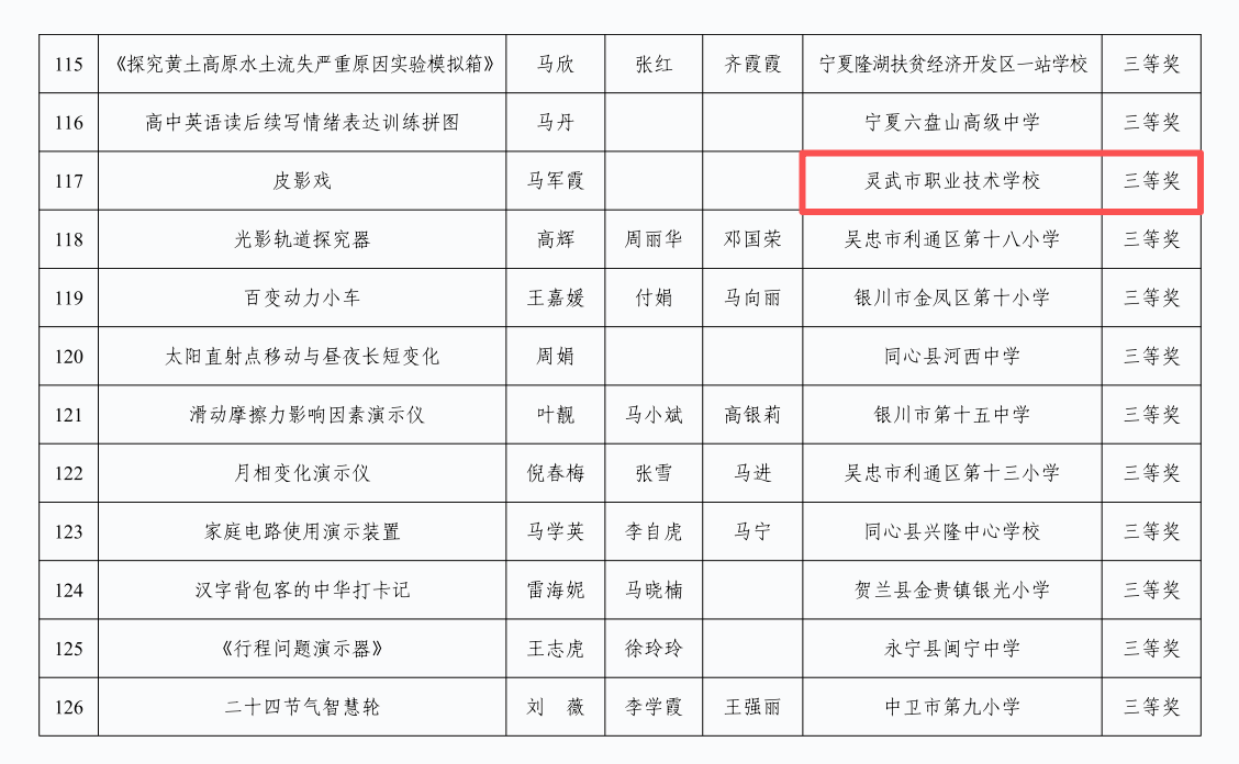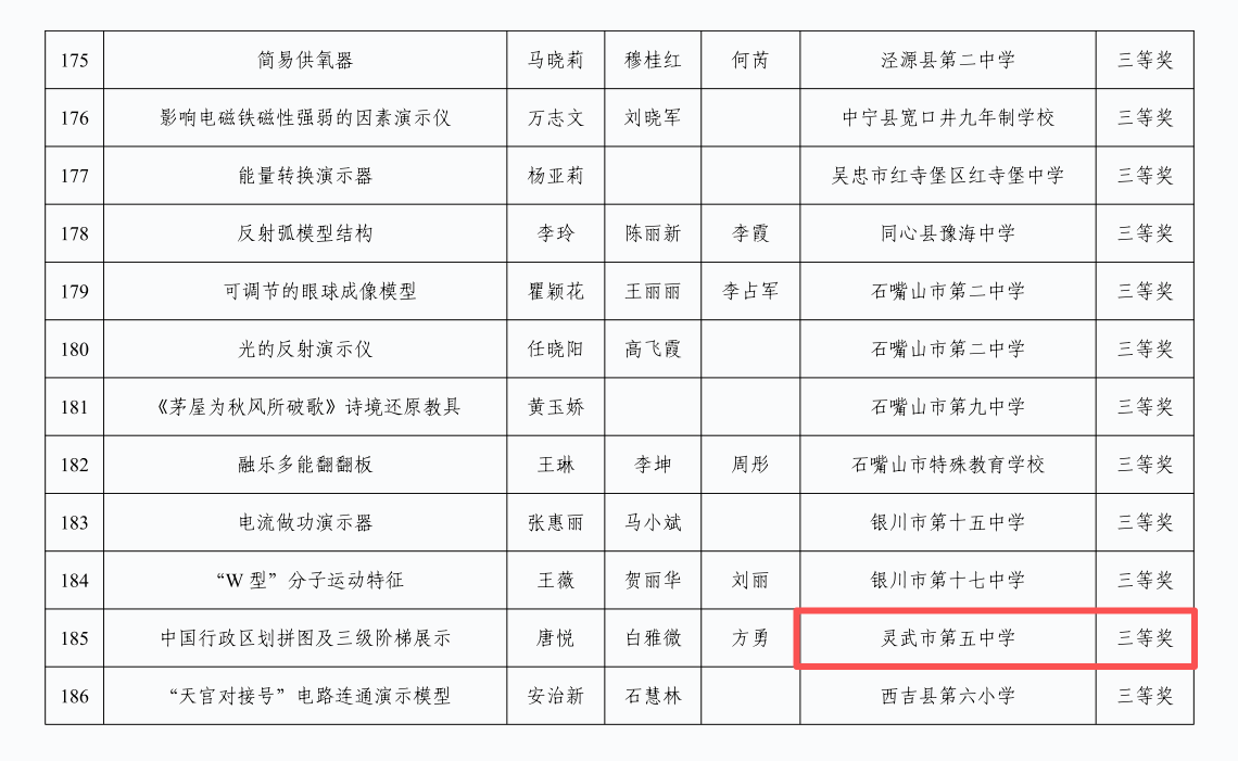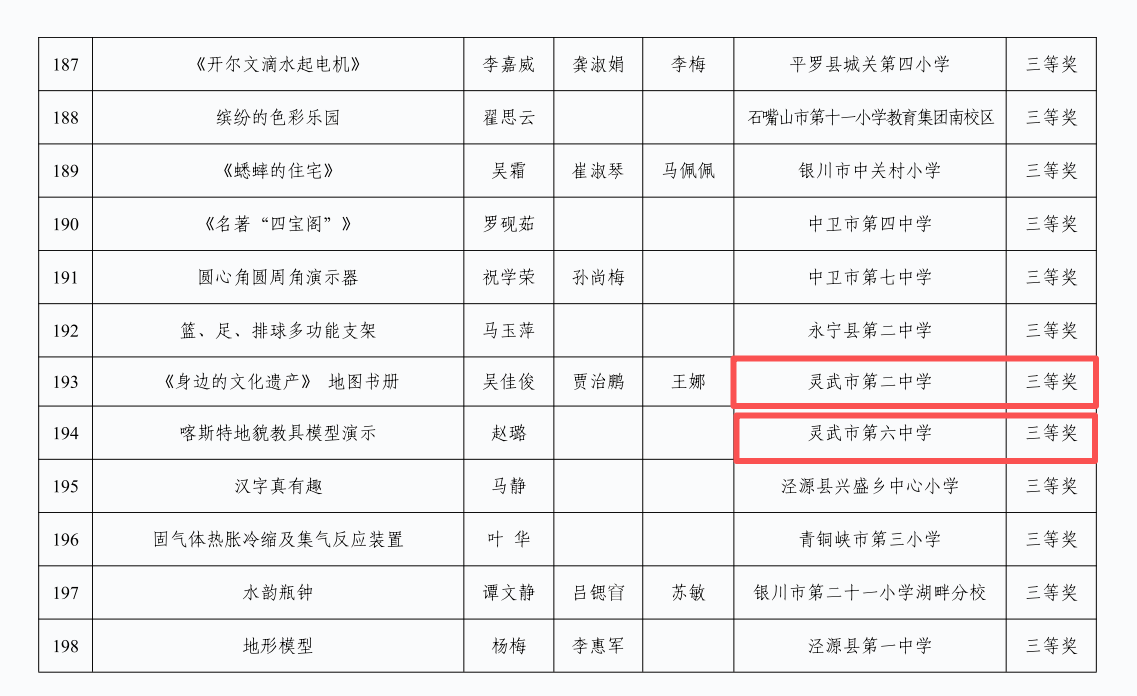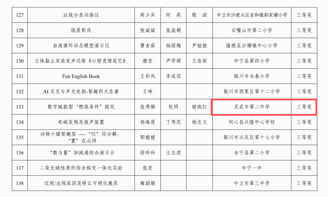 10月19日至21日,自治区教育厅第十一届全区中小学优秀自制教具展评活动在北京师范大学银川学校中学部成功举办。灵武市各中小学积极参与、精心创作,共有 10 件作品脱颖而出,分别荣获一等奖1个、