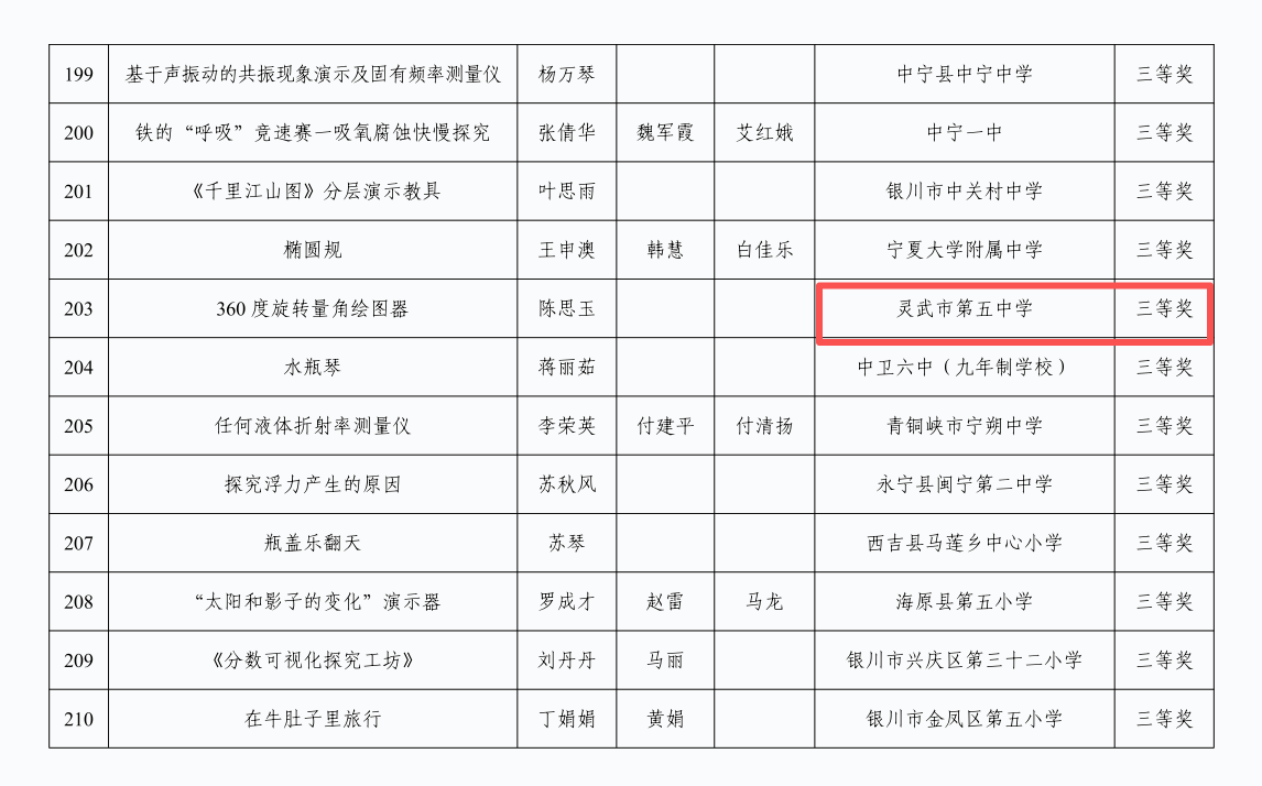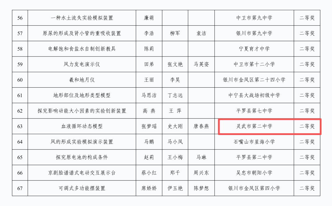 二等奖3个、 三等奖6个,充分展现了灵武市中小学教师在教具创新设计与实践应用方面的扎实功底和创新能力,具体获奖作品如下。