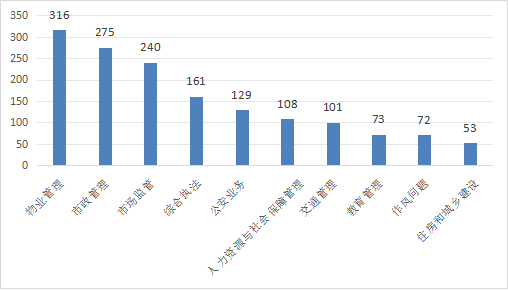 占比20.68%)、市政管理(275件,占比18.00%)、市场监管(240件,占比15.71%)、综合执法(161件,占比10.54%)、公安业务(129件,占比8.44%)、人力资源与社会保障管理(108件,占比7.07%)、交通管理(101件,占比6.61%)、教育管理(73件,占比4.78%)、作风问题(72件,占比4.71%)、住房和城乡建设(53件,占比3.47%)。