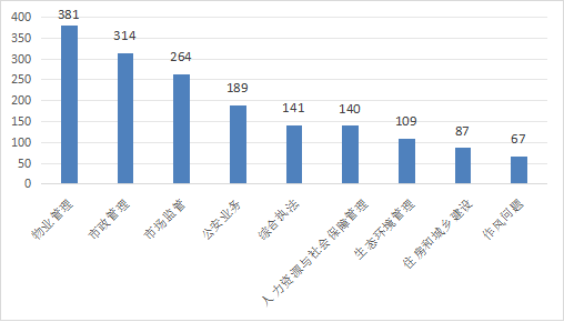 7月,群众反映前10的热点诉求依次为物业管理(381件,占比21.80%)、市政管理(314件,占比17.96%)、市场监管(264件,占比15.10%)、公安业务(189件,占比10.81%)、综合执法(141件,占比8.07%)、人力资源和社会保障管理(140件,占比8.01%)、生态环境管理(109件,占比6.24%)、教育管理(107件,占比7.30%)、住房和城乡建设(87件,占比4.98%)、作风问题(67件,占比3.83%)。