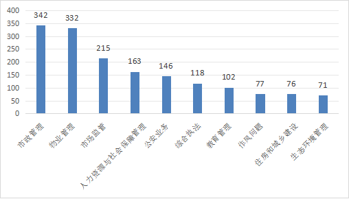 8月,群众反映前10的热点诉求依次为市政管理(342件,占比20.83%)、物业管理(332件,占比20.22%)、市场监管(215件,占比13.09%)、人力资源和社会保障管理(163件,占比9.93%)、公安业务(146件,占比8.89%)、综合执法(118件,占比7.19%)、教育管理(102件,占比6.21%)、作风问题(77件,占比4.69%)、住房和城乡建设(76件,占比4.63%)、生态环境管理(71件,占比4.32%)。