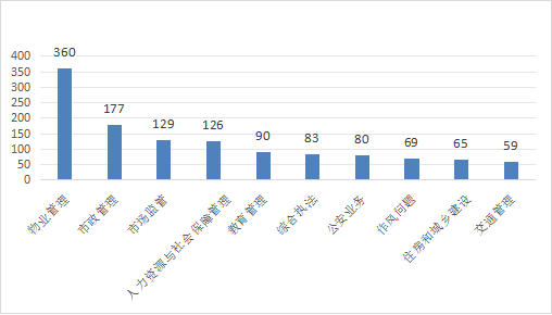 9月,群众反映前10的热点诉求依次为物业管理(360件,占比28.92%)、市政管理(177件,占比14.22%)、市场监管(129件,占比10.36%)、人力资源和社会保障管理(126件,占比9.55%)、教育管理(90件,占比7.23%)、综合执法(83件,占比6.67%)、公安业务(80件,占比6.43%)、作风问题(69件,占比5.54%)、住房和城乡建设(65件,占比4.92%)、交通管理(59件,占比4.74%)。