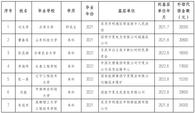 根据《宁夏回族自治区学生资助资金管理办法》(宁财规发〔2022〕25号)和《自治区教育厅、财政厅、人力资源和社会保障厅关于进一步规范基层就业学费补偿和国家助学贷款代偿申请受理审核工作的通知》(宁教学〔2024〕53号)等文件要求,经高校毕业生个人申请,县教育局审核,区级专家审查确认,2024年度灵武市教育体育局受理拟享受宁夏基层就业学费补偿国家助学贷款代偿人员共计7人,13.92万元。现将名单予以公示(公示名单详见附件)。