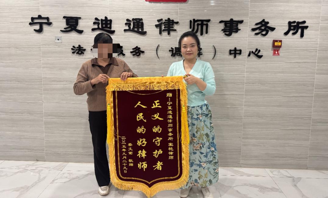 2025年9月29日,委托人蔡女士专程走进宁夏迪通律师事务所,将一面印着“正义的守护者 人民的好律师”的锦旗郑重交到窦艳律师手中。这面锦旗不仅是对窦律师个人专业能力与负责态度的肯定,更映照出法律援助制度为困境群众打通维权通道的关键作用。