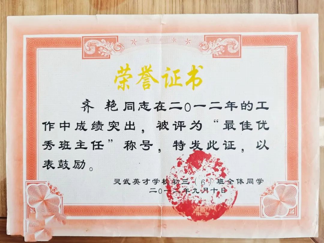 这张“跨时代”的特殊奖状,让八年级(6)班的学生重拾了信心,也更加坚定了他们今后要努力的决心。军训过后,时间转移到教师节表彰大会上,学校宣读的优秀教师名单里,并没有齐艳老师的名字,而在一周后的班会课后,齐艳老师却收到了一份印有萝卜刻成班级章戳印的红色大奖状:齐艳同志,在2012年的工作中成绩突出,被评为最佳班主任,特发此证。