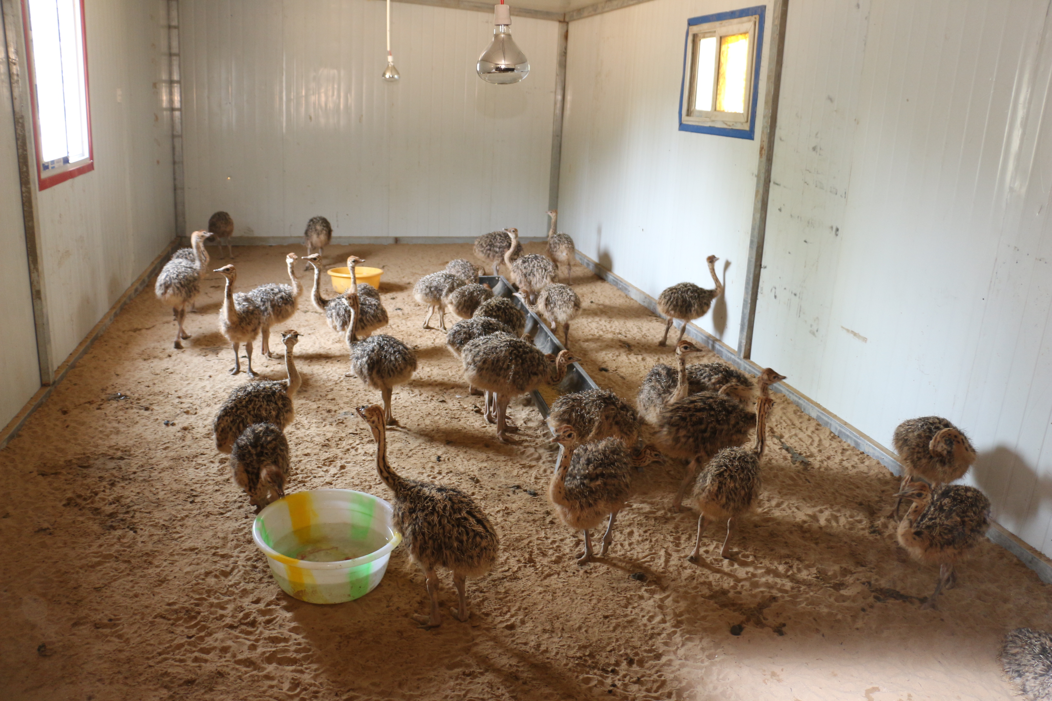 “此次引进的100只小鸵鸟是刚孵化满一个月的幼鸟。为了让它们更快地适应新环境,我们按照它们之前的饲养习惯,每天喂得是新鲜的莲花菜、小鸡饲料,还在餐食了配了多维电解质防止应急反应。”白芨滩林农牧业发展专业合作社的社长马国栋说。