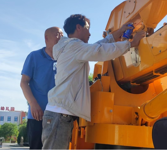 此次检查内容主要为:升降车的升降机构、臂架、转台、液压系统、吊装钢丝绳等方面。经检查发现存在以下问题:一是升降车油缸处因长时间运行缺少润滑而发生磨损出现声响现象;二是吊装部分行程开关不灵敏、钢丝绳有扭曲现象。技术人员现场指导驾驶员对各个连接部位喷涂润滑剂,并讲解了作业车在润滑不良的情况下工作所造成的危害。吊装作业存在的风险,要求工作人员及时更换行程开关,重新缠绕钢丝绳,确保车辆正常使用。最后,技术人员又详细讲解了车辆日常保养及使用中存在的问题。