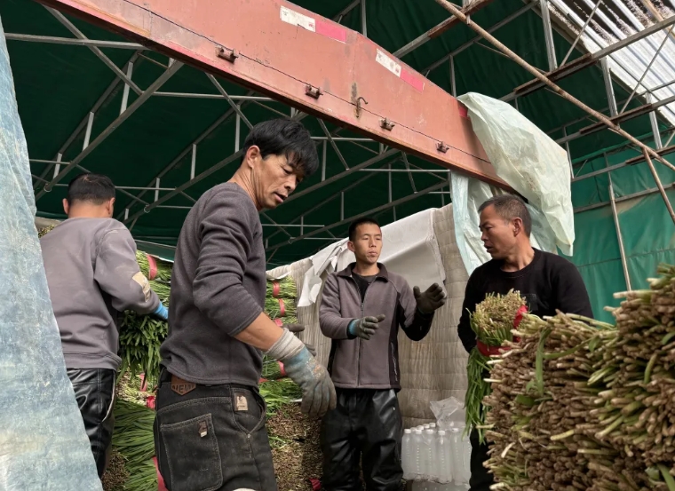 现在正是韭菜销售的旺季,为了保证韭菜的口感和品质,种植户们将韭菜收割扎捆后,第一时间拉到韭菜交易收购处过磅称重,韭菜经纪人有序将拉运来的韭菜装车运往外地市场。