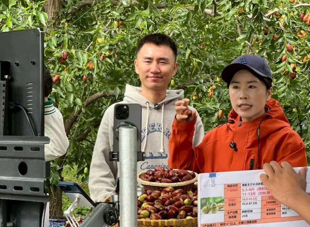 直播镜头前,牧飒拿着刚从树上摘下的灵武长枣,轻轻咬下一口,清脆的声响透过麦克风传向屏幕另一端:“大家看,灵武长枣果肉饱满,咬着又甜又脆,这就是家乡最地道的味道!”一旁的车车姐则拿起长枣向网友展示细节,时不时与弹幕互动,解答“如何保存”“甜度多少”等问题,两人默契配合,将枣园的丰收氛围与长枣的优质特点生动呈现。
