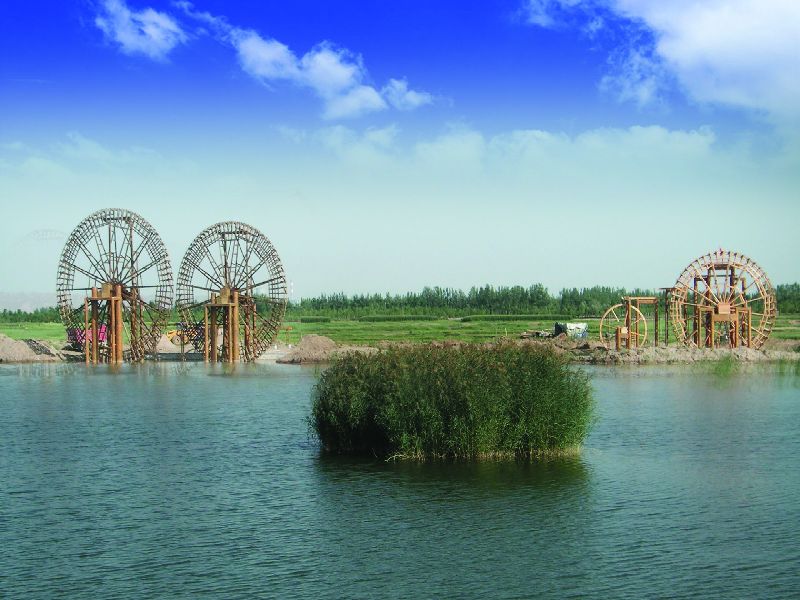 为增添文化气息,扮靓黄河金岸,灵武市在滨河大道两侧梧桐湖上规划设计并开工建设了独具特色的世界水车博览园。该博览园规划占地总面积1200亩,总投资约5000万元,分二期建设,由水车展示园、水车博物院、休闲活动区等功能区组成,是一个以展现黄河农耕文化和水车发展历史为主的特色主题公园。一期规划建设古今中外水车11座,其中:直径18米的兰州黄河水车1座、12—16米的龙头黄河水车4座、云南竹筒水车1座、丽江水车1座、叙利亚哈马水车1座、美国水车1座、古罗马水车1座。目前,灵武市正在加紧园区建设,已完成湖面开挖和水车基础施工,完成景观桥及部分基础设施建设,10组水车基本制作完毕。世界水车博览园建成后将成为汇集古今中外各种造型、各种功能水车,再现黄河、水车与农业生产和谐景象的沿黄标志性景区景点。