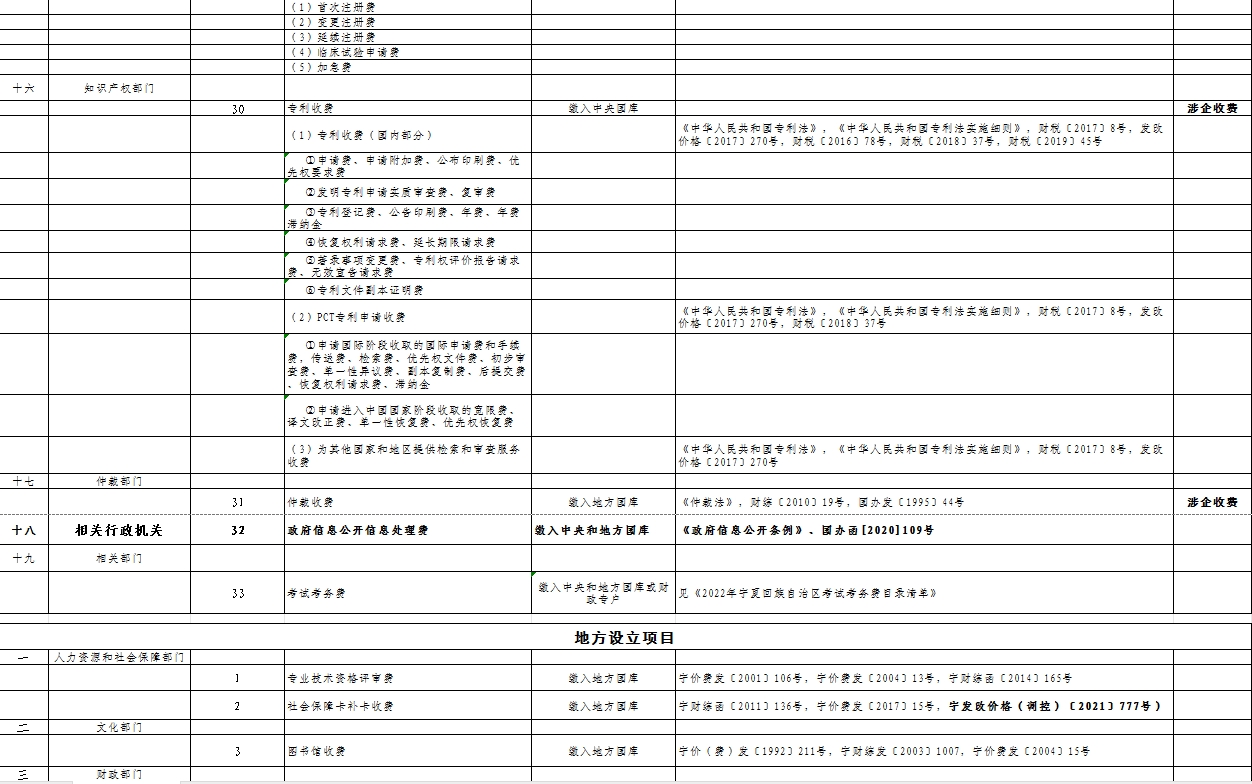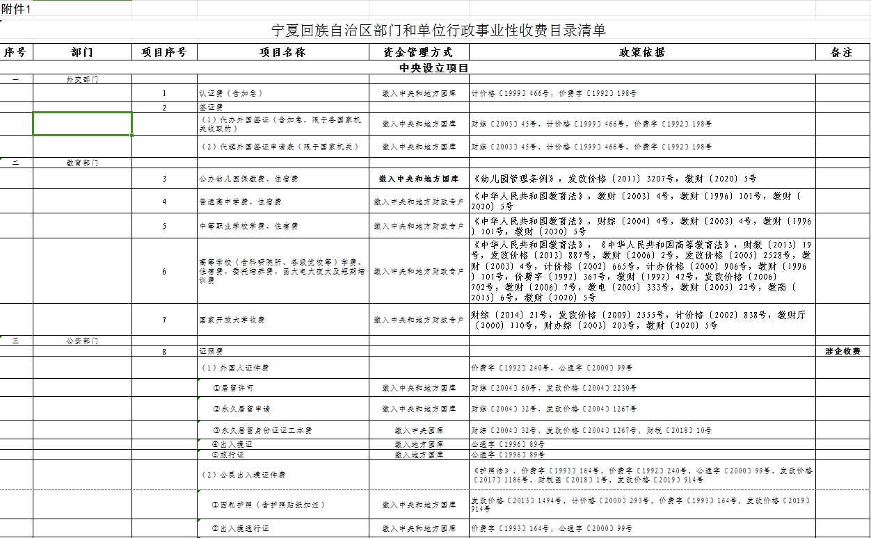 宁夏回族自治区部门和单位行政事业性收费目录清单
