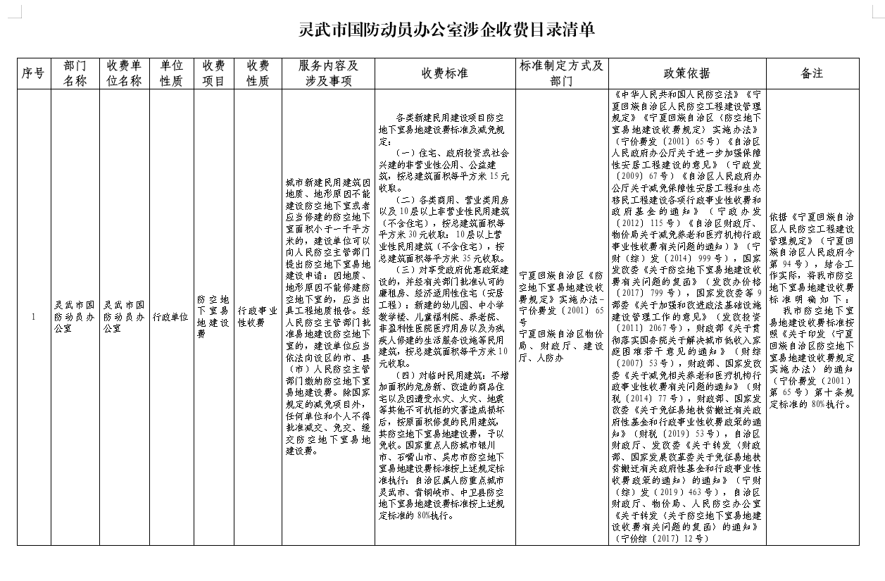 灵武市国防动员办公室涉企收费目录清单