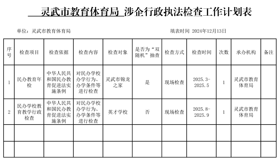 灵武市教育体育局涉企行政执法检查工作计划表