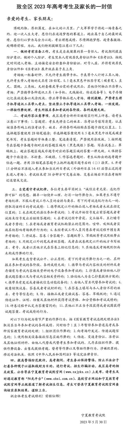 宁夏2023年高考考生及家长注意!这封信请查收!