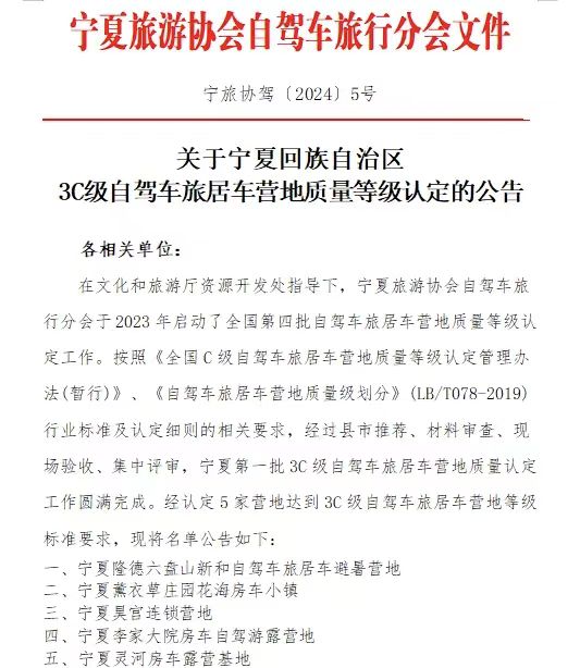 3月19日,宁夏灵河房车露营基地被宁夏旅游协会自驾游旅行分会认定为3C级自驾车旅居车营地。