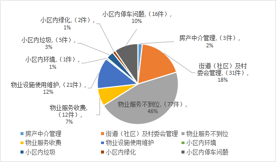 1.物业管理168件,占总诉求的13.56%。主要反映物业服务不到位及收费不合理、设施使用维护不及时,街道(社区)及村委会管理,停车秩序混乱及收费不合理、楼道内环境卫生清理、绿化养护等。