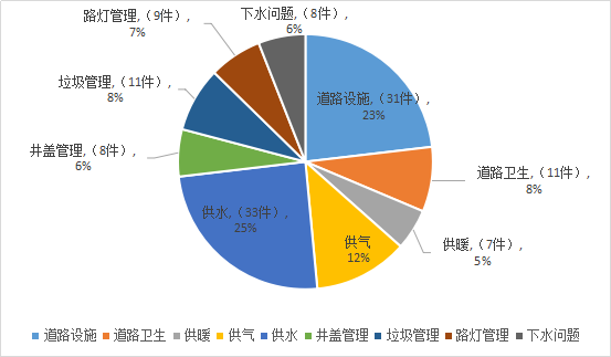 2.市政管理134件,占总诉求的10.81%。主要反映区域停水、水费(水表核准问题)收取不合理,道路卫生清理,公厕管理,垃圾站管理,供热改造及暖气费用收取不合理,道路坑洼破损及施工噪音扰民问题,天然气安装开通及收取费用不合理,路灯故障,井盖丢失破损,公共下水管道堵塞等。