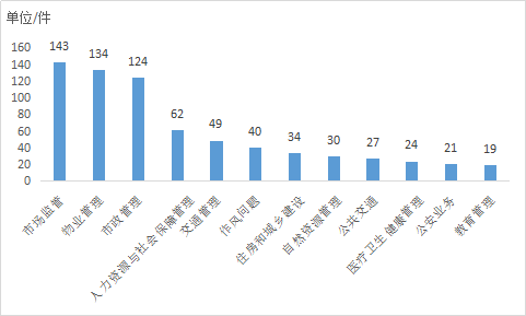 城市建设类592件:涉及的问题有住房建设管理、物业管理、市政管理、交通管理、综合执法管理、生态环境管理、市场监管、公安业务、自然资源管理等。