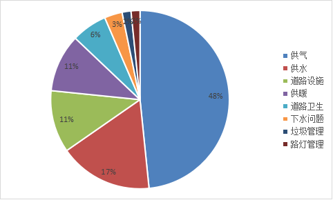 3.市政管理124件,占总诉求的15.21%。主要反映水木灵州二期、上元名城A区、绿地宝塔、玫瑰苑、盛世嘉园欧景豪庭等小区停气,停暖及供暖质量差,供暖费用收取不合理,灵春花园、灵州花园一期、崇兴镇杜家滩村、郝家桥镇兴旺村六队停水,熙水台、西湖裕景水质差,建议维修富兴街路灯,公厕管理,垃圾中转站管理,道路坑洼破损,井盖丢失破损等。