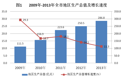 初步核算,全年全市实现生产总值286.8亿元,按可比价格计算,比上年增长11.3%。分产业看,第一产业完成增加值9.7亿元,增长4.5%;第二产业完成增加值247.1亿元,增长12.2%;第三产业完成增加值30.0亿元,增长6.5%。按常住人口计算,人均地区生产总值92658元。三次产业结构比为3.4:86.1:10.5,对经济增长的贡献率分别为1.4%、91.9%、6.7%。
