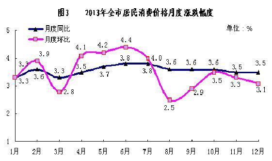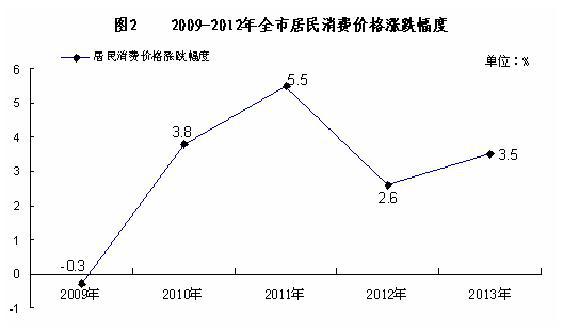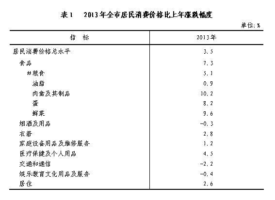 全年居民消费价格总水平比上年上涨3.5%,其中食品价格上涨7.3%,医疗保健及个人用品类价格上涨4.5%,衣着类价格上涨2.8%,居住类价格上涨2.6%,家庭设备用品及维修服务类价格上涨1.2%,烟酒及用品类价格下降0.3%,娱乐教育文化用品及服务类价格下降0.4%,交通和通信类价格下降2.2%。工业生产者出厂价格下降5.0%,工业生产者购进价格下降3.1%,新建住宅价格上涨5.8%,商品零售价格上涨2.3%。