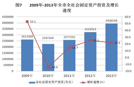 全年完成全社会固定资产投资393.7亿元,比上年增长22.0%。其中,建设安装投资196.2亿元,增长23.4%;房地产开发投资15.8亿元,增长29.6%。分投资主体看,国有经济投资280.9亿元,增长52.4%;非国有经济投资112.8亿元,下降18.4%。从投资结构看,第一产业投资3.4亿元,比上年增长326.7%;第二产业投资320.0亿元,增长10.7%,其中工业投资320.0亿元,增长10.7%;第三产业投资70.3亿元,增长114.3% 。