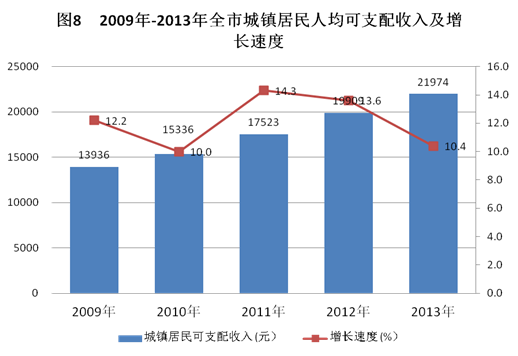 全年城镇居民人均可支配收入21974元,比上年增加2065元,增长10.4%。城镇居民人均消费性支出13876元,下降1.3%。城市居民人均住房建筑面积28.4平方米,下降3.0%。